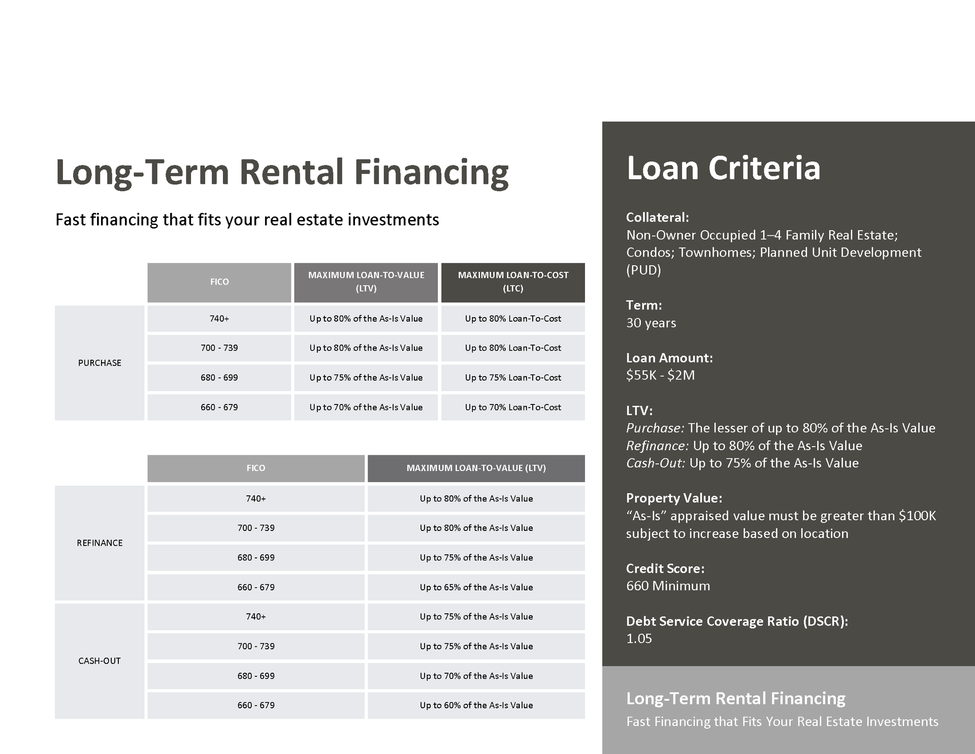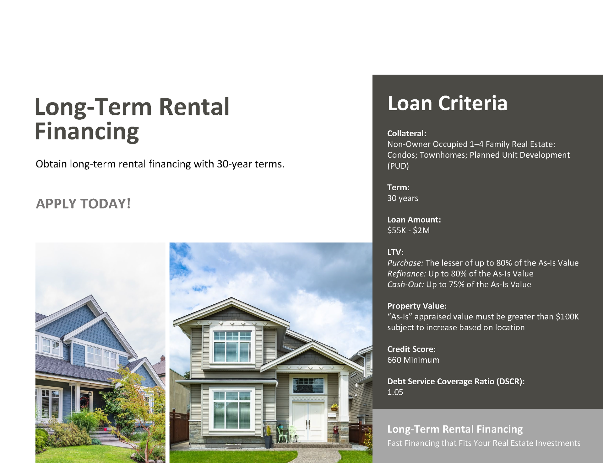 We focus on offering a diverse array of business-purpose loans specifically tailored for real estate investors. Whether you're an experienced investor with a robust portfolio or embarking on your very first venture into the property market, we understand that securing dependable, flexible financing is crucial for the overall success of your endeavors.