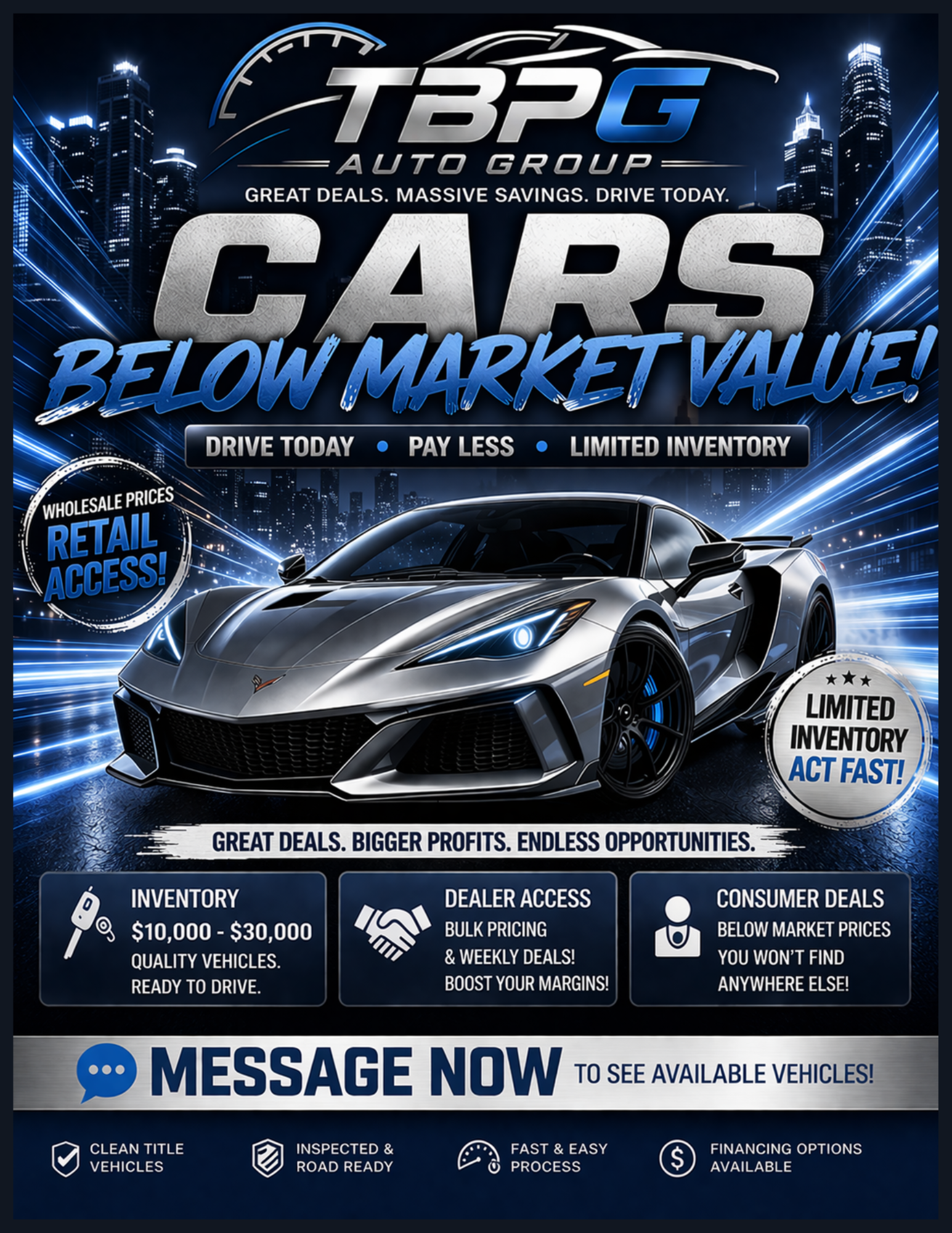Whether you are a dealer seeking inventory, a consumer looking for your next vehicle, or a non-profit exploring innovative fundraising solutions, TBPG Auto Group is ready to help you move forward with confidence.