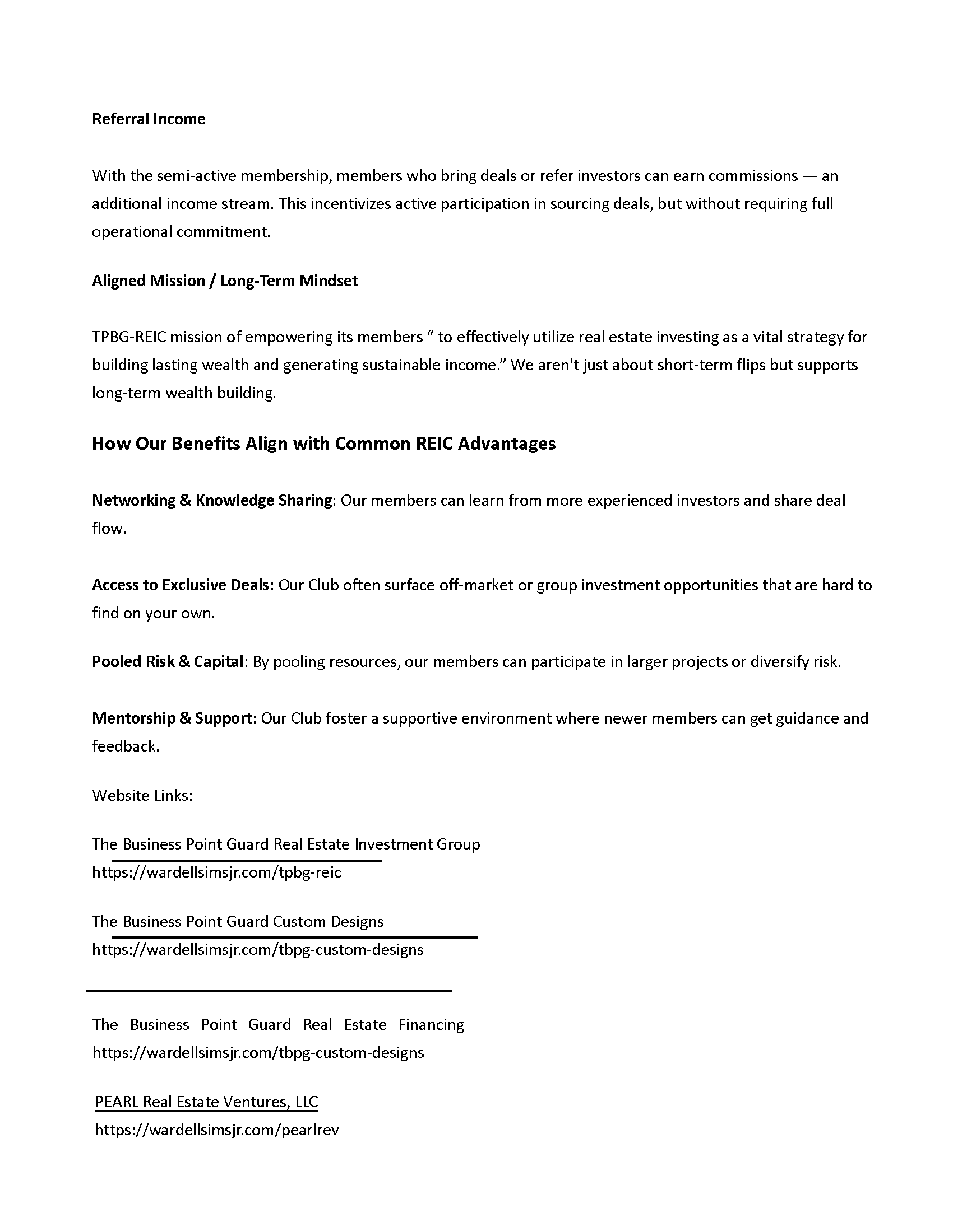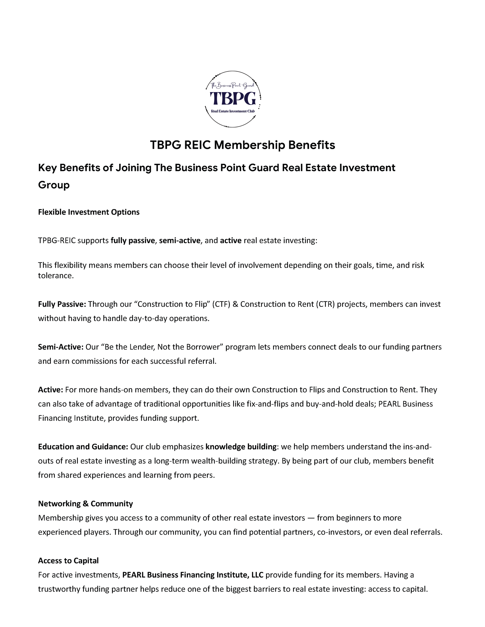 TBPG Real Estate Investment Club is dedicated to providing a range of active investment opportunities that encompass traditional real estate options, including but not limited to fix-and-flips and buy-and-holds. In this dynamic role, PEARL Business Financing Institute, LLC functions as the invaluable funding partner for its members, ensuring they have the capital needed to seize lucrative real estate ventures.