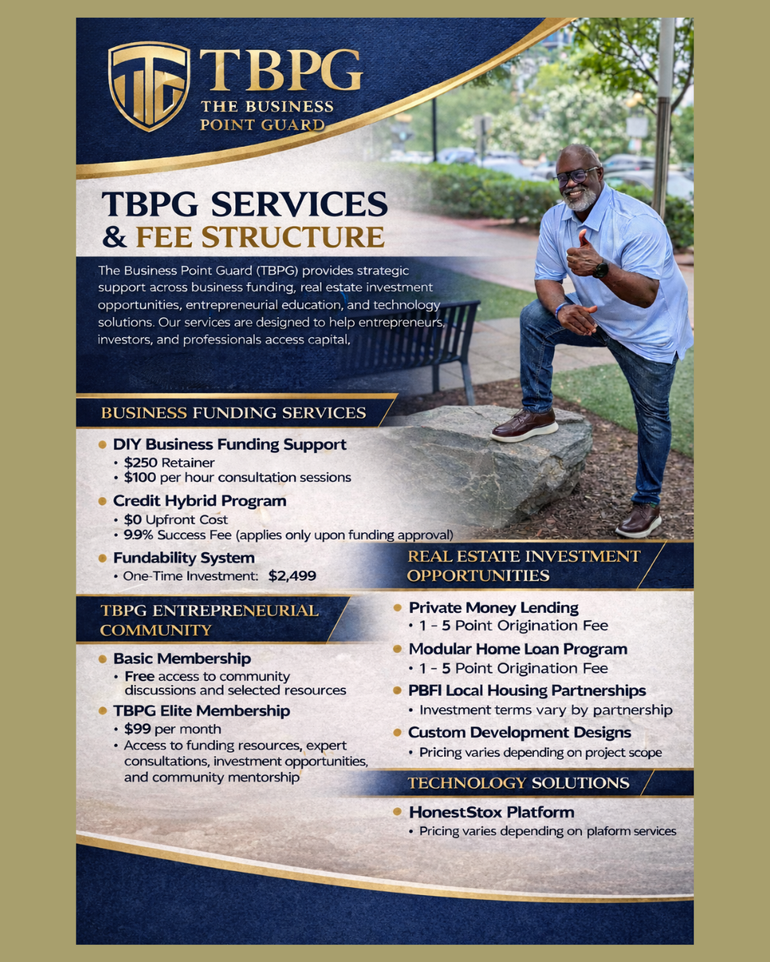 I founded The Business Point Guard (TBPG) and PEARL Business Financing Institute LLC (PBFI) to empower individuals—entrepreneurs, professionals, and investors—to create wealth without having to navigate the journey on their own.