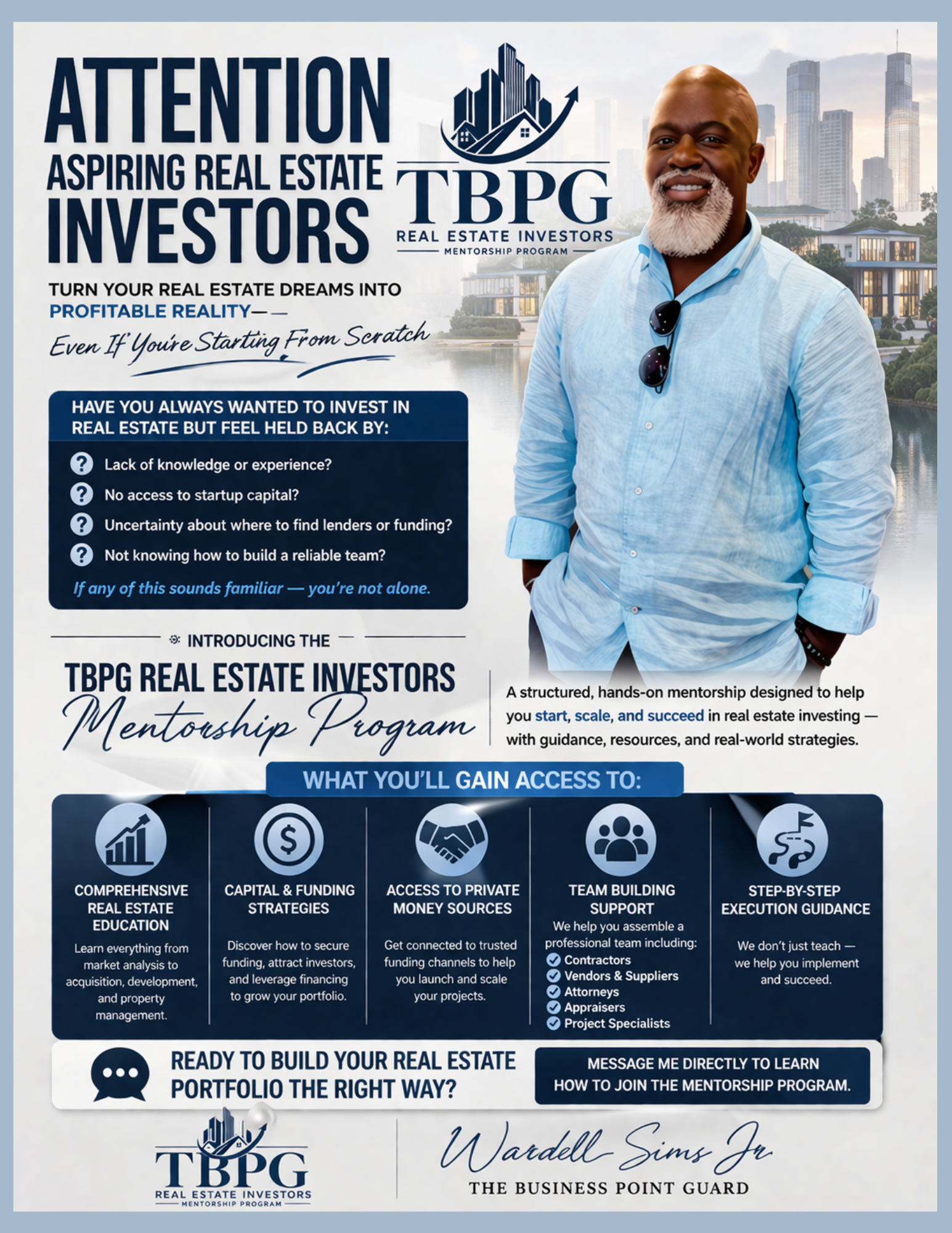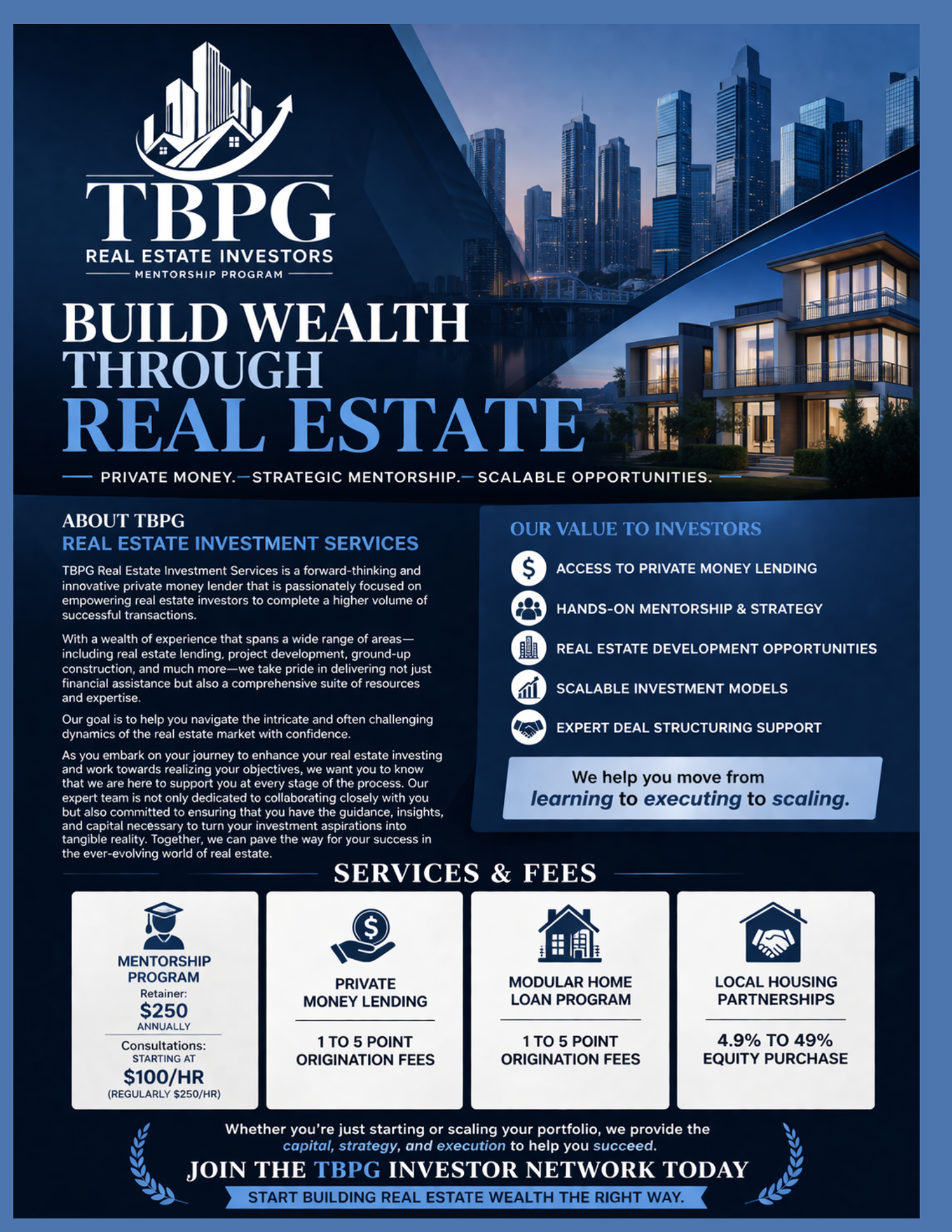 The TBPG Real Estate Investors Mentorship Program provides an invaluable platform for mentees by offering them access to a wealth of resources, including expert consultations tailored to their specific needs. Participants can also benefit from private money lending options, which can greatly enhance their ability to finance real estate deals. Additionally, the program connects mentees with a variety of investment opportunities through carefully curated local housing partnerships, ensuring they have the tools and connections necessary to succeed in the competitive real estate market.