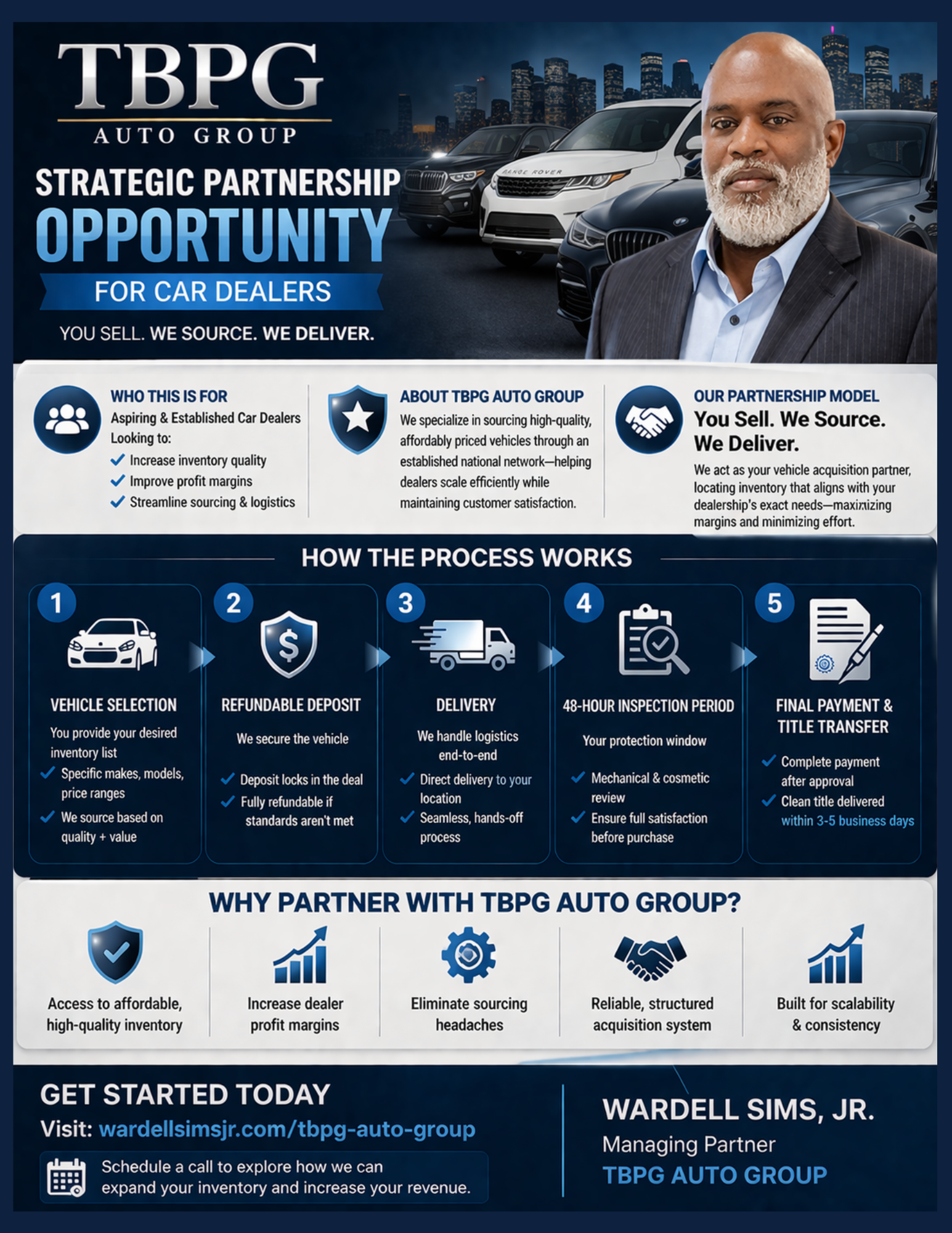 The TBPG Auto Group Strategic Partnership Opportunity offers dealers and the public the chance to acquire vehicles with a commitment to professionalism, efficiency, and integrity. Our mission is to deliver significant value to our clients by providing dependable vehicle solutions that meet both personal and business needs.