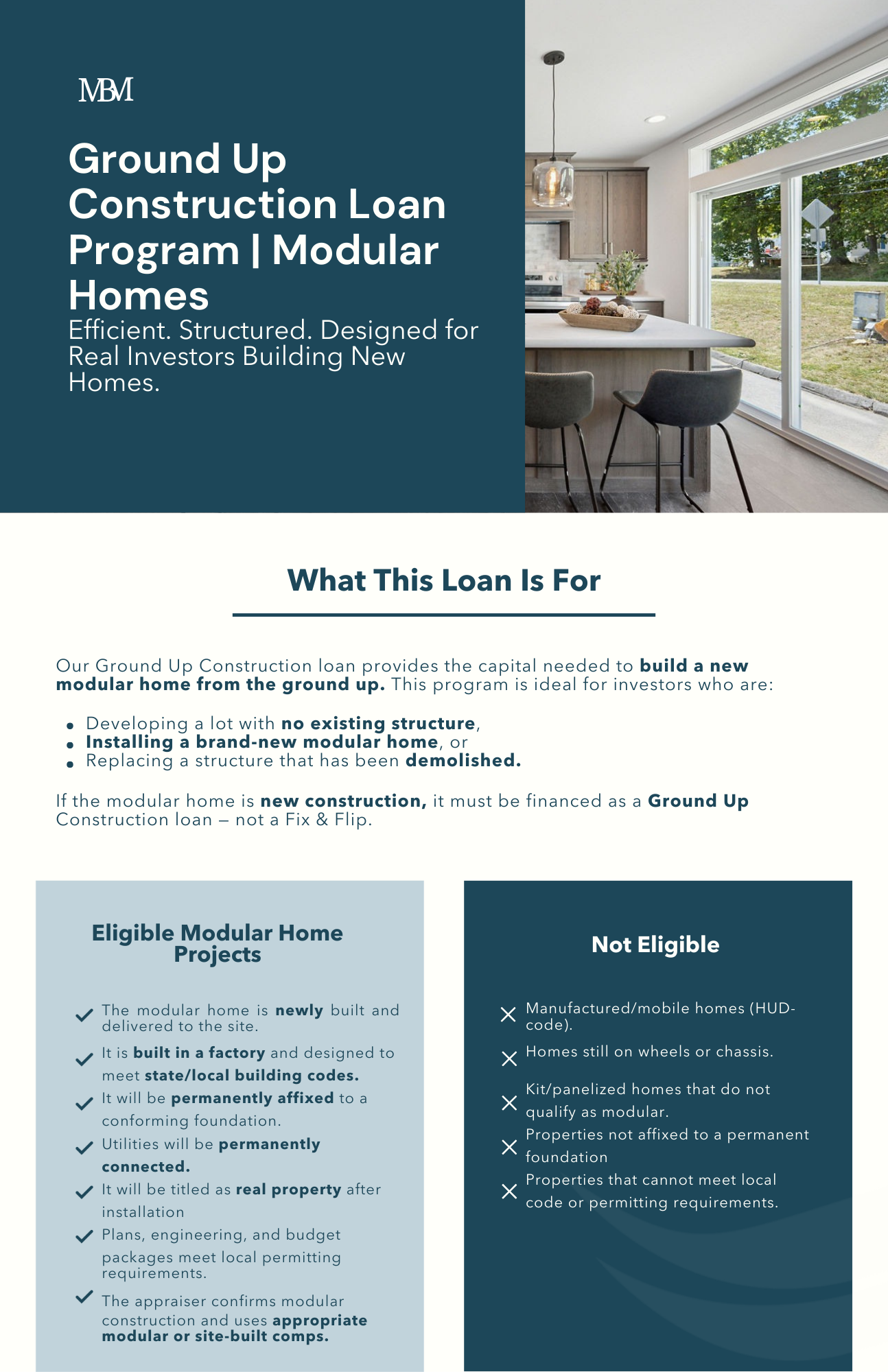 The TBPG Modular Home Loan Program provides real estate investors the essential capital needed to construct brand-new modular homes on vacant lots — including replacement builds where a prior structure was demolished.