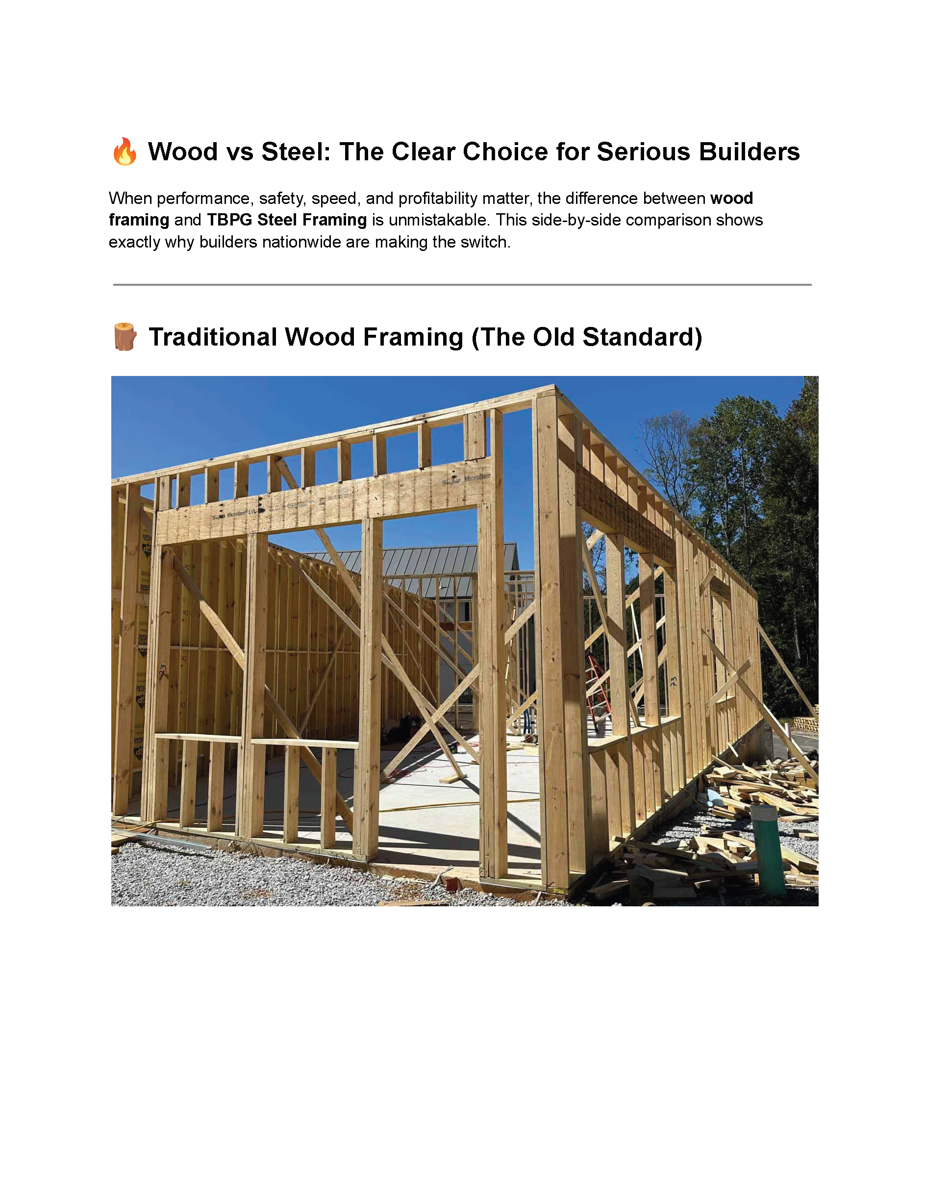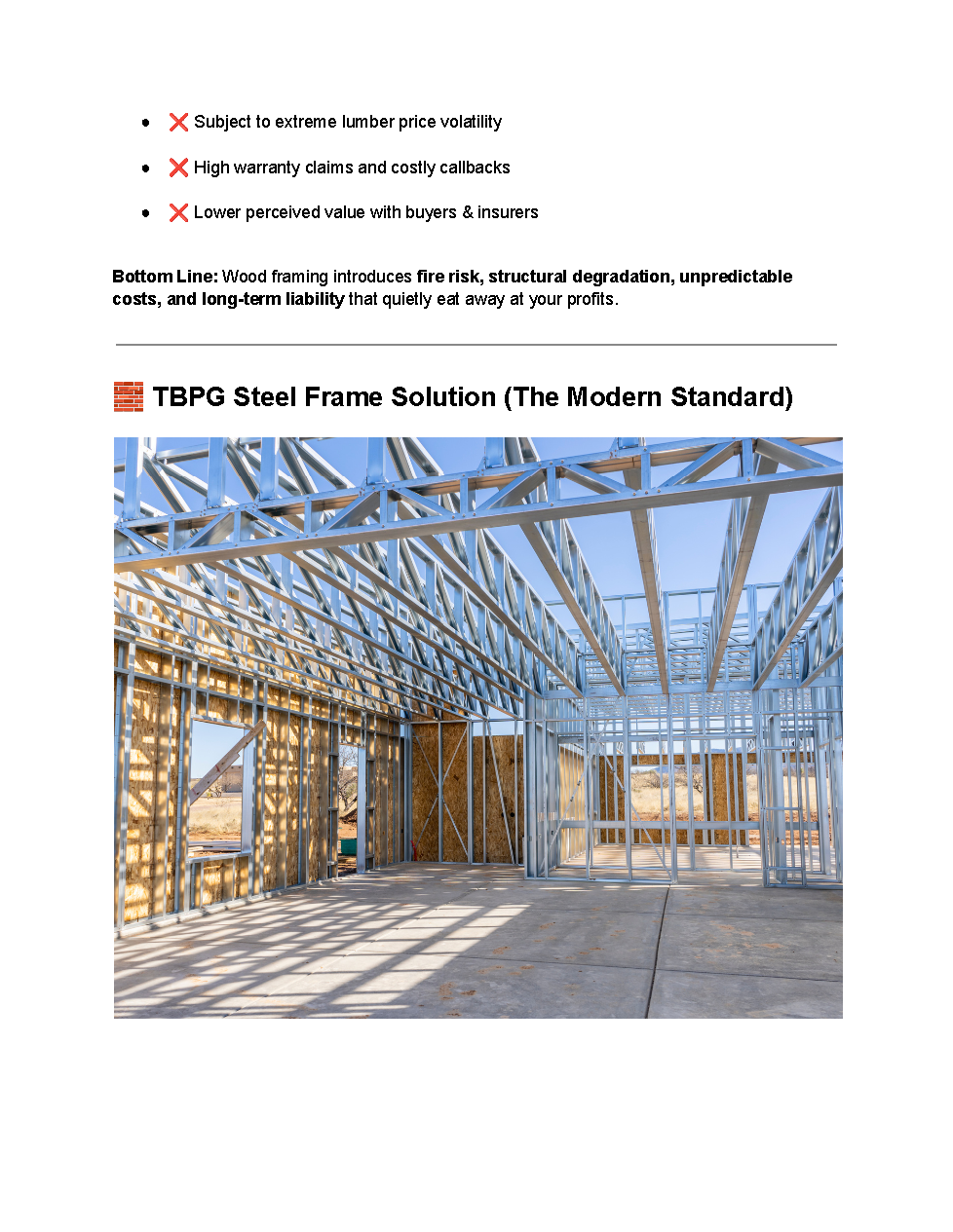 Wood framing is no longer the smartest way to build. Rising material costs, fire risks, moisture damage, callbacks, and structural failures are cutting into builder profits nationwide. The TBPG Steel Frame Solution replaces outdated wood-framing with precision-engineered steel construction systems designed to help builders build faster, safer, and more profitably.